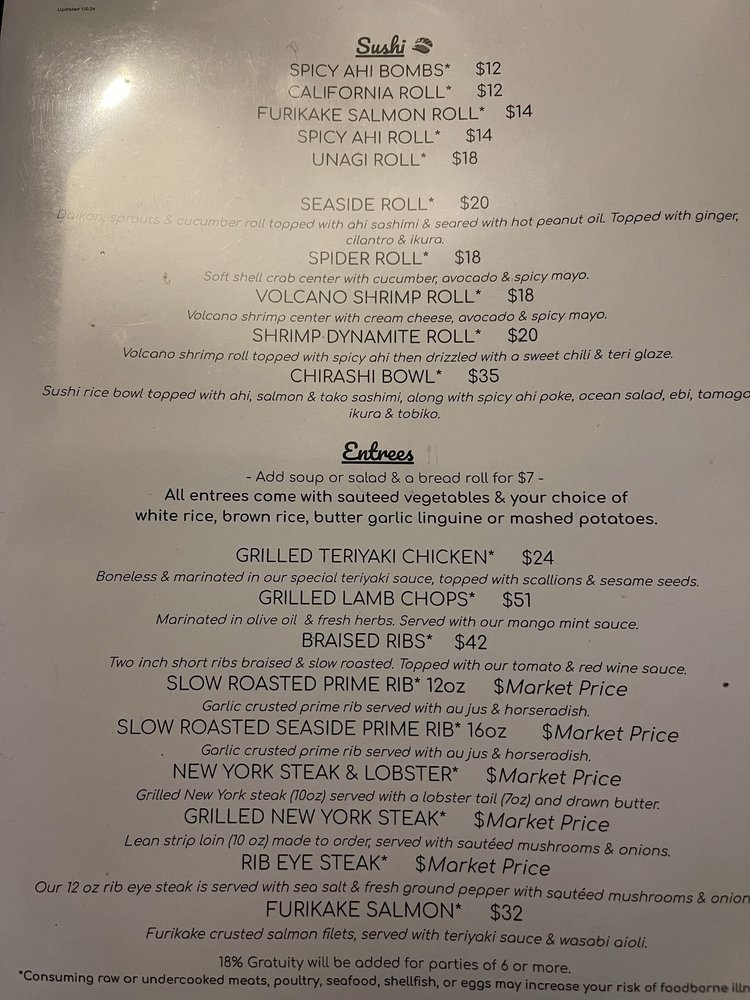 Start your meal with enticing appetizers like Spicy Ahi Bombs or the classic California Roll. The standout entrees are a treat for meat and seafood lovers alike, featuring choices like the succulent Slow Roasted Prime Rib and the exquisite New York Steak Lobster. For dessert, indulge in creations like the Kona Coffee Mud Pie for a delightful finish.